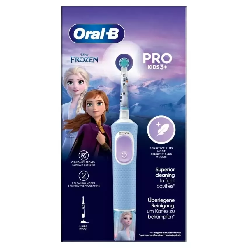 ORAL-B SÄHKÖHAMMASHARJA VITALITY PRO KIDS FROZEN. Yli 3-vuotiaille suunniteltu hammasharja, joka auttaa puhdistamaan paremmin ja hellävaraisemmin. Poistaa enemmän plakkia kuin tavallinen käsikäyttöinen hammasharja. Pakkaukseen sisältyy neljä tarraa.