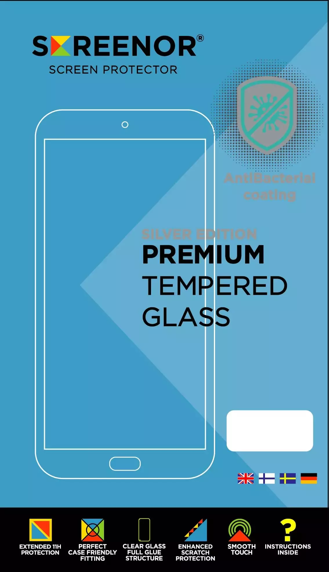 Screenor Premium tempered on suora perusnäytönsuojalasi. Se valmistetaan kirkkaasta lämpökäsitellystä iskunkestävästä lasista Screencoat -nanopinnoitteella. Premium Tempered kiinnittyy kokonaan puhelimen näyttöönstaattisesti silikonikiinnityksellä. Tämä antaa lasille hyvän kosketusherkkyyden. Premium tempered on yhteensopiva kaikkien perinteisten ja alkuperäisten kuorien kanssa. Silver-edition malli on pinnoitettu antibakteerisella Screencoat-nanopinnoitteella joka hylkii jopa 99,9% yleisimmistä bakteereista.