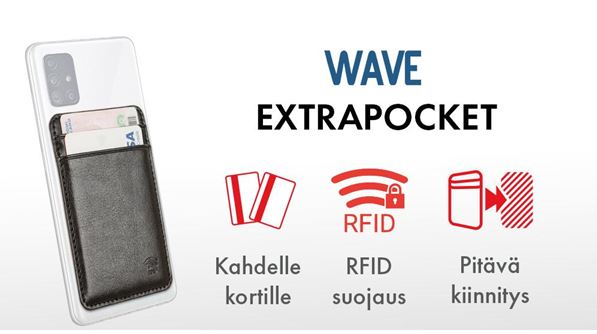 Wave Extrapocket on näppärä tarvike lisäkorttipaikkoja tarvitsevalle. Extrapocket on helppo kiinnittää esimerkiksi puhelimen takakuoreen, ja vahva uudelleen käytettävä liimapinta takaa, ettei lisäkorttipaikka tipu kyydistä kovemmassakaan vauhdissa.