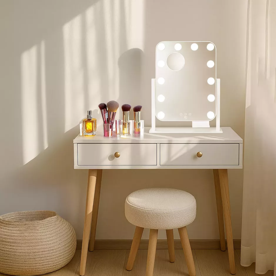 EC by Wilfa Shine tarjoaa kaiken tarvittavan tarkkaan ja tehokkaaseen kauneusrutiiniin. Tämä kompakti peili sisältää 12 LED-lamppua klassisessa Hollywood-tyylissä, portaattoman kirkkaudensäädön sekä käytännöllisen koon, joka sopii täydellisesti kampauspöydälle, työpöydälle tai hyllylle.