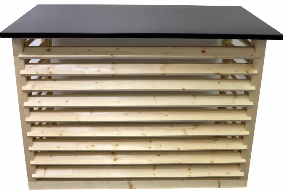 Kuusesta tehty ilmalämpöpumpun ulkoyksikön suojakotelo mustalla metallisella katolla.