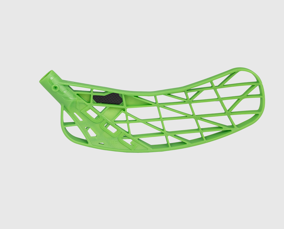 Hiilikuituvahvike tuo kiertojäykkyyttä sekä keveyttä lapaan. MB-materiaali takaa pehmeän pallokosketuksen. Maltillisempi 9mm kouru pitää syötöt maassa antaen myös lisäpotkua laukauksiin. Lapaa käyristäessä muista aina huolellinen lämmitys ja jäähdytys.