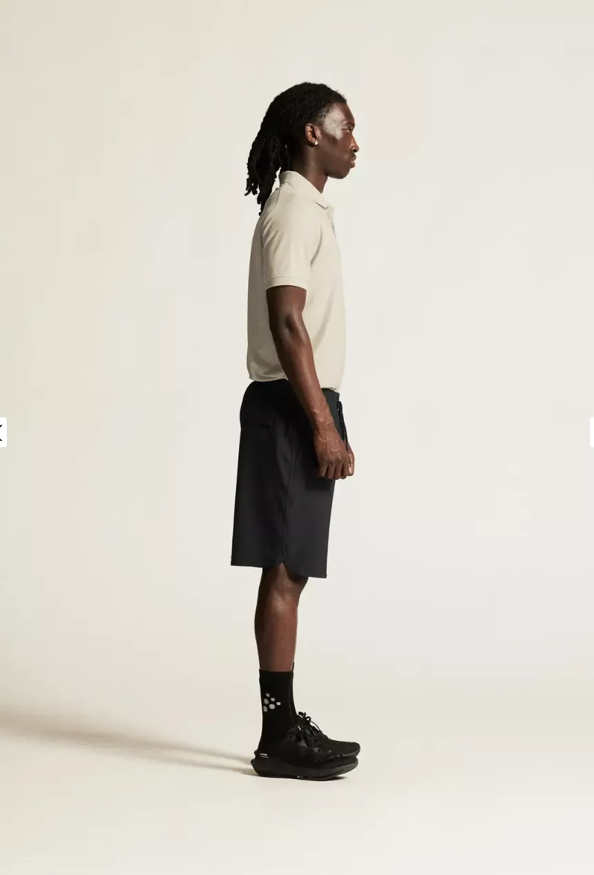 Shortsit on valmistettu joustavasta, kierrätetystä polyesteri-elastaanikankaasta, jossa on hienostunut jakardikuvioitu pinta. Ne yhdistävät mukavuuden, suorituskyvyn ja huolitellun ulkonäön. Joustava vyötärönauha sisäpuolisella kiristysnyörillä takaa hyvän istuvuuden, ja käytännölliset säilytysratkaisut – kaksi sivutaskua ja vetoketjullinen takatasku – tekevät shortseista toimivat niin treenissä kuin arjessa.