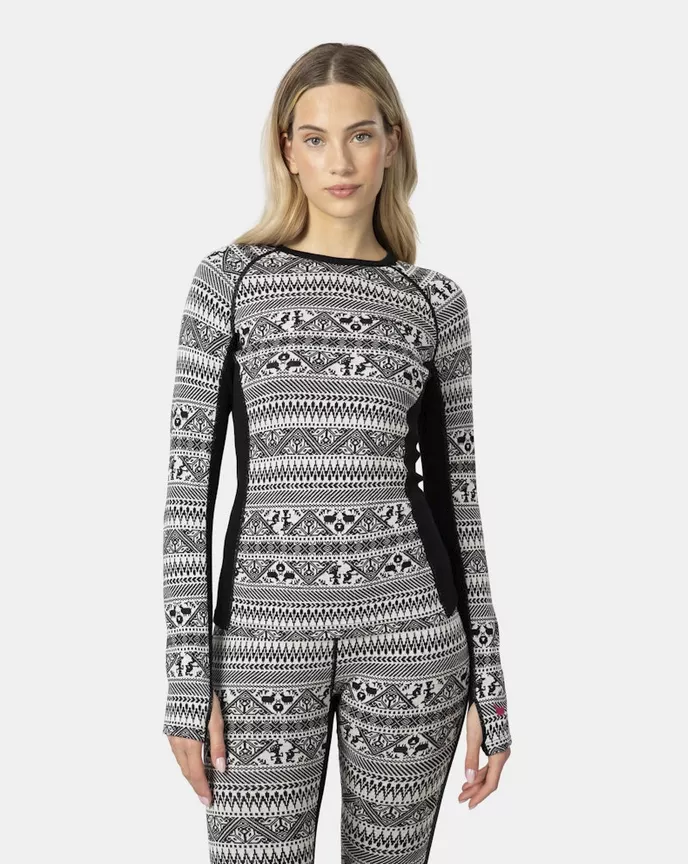 Hiihto-inspiroitu jacquard-neulekuvio ja rohkeat kontrastiväriset paneelit tekevät paidasta näyttävän ja monikäyttöisen – se toimii yhtä hyvin rinteessä, vaelluksella kuin vapaa-ajalla. Slim fit -istuvuus, pyöreä pääntie ja peukaloaukot hihansuissa lisäävät käyttömukavuutta ja istuvuutta.