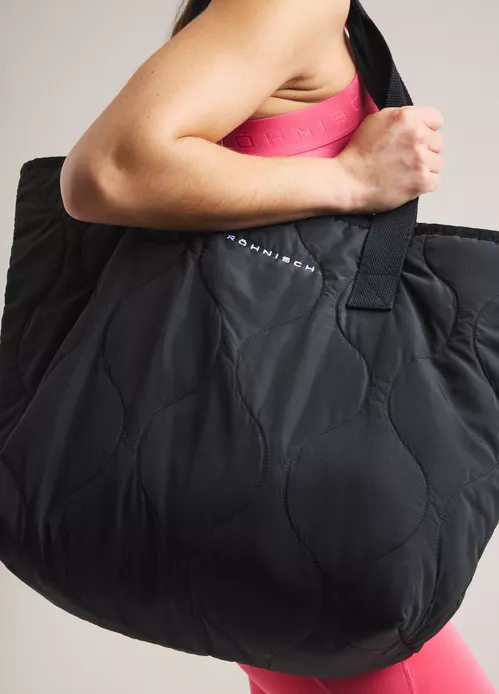 Naisten tikkikangas laukku kierrätetystä materiaalista. Päällä heijastava kiristysnaru ja sisällä tasku. Sivussa brodeerattu Röhnisch -logoteksti.