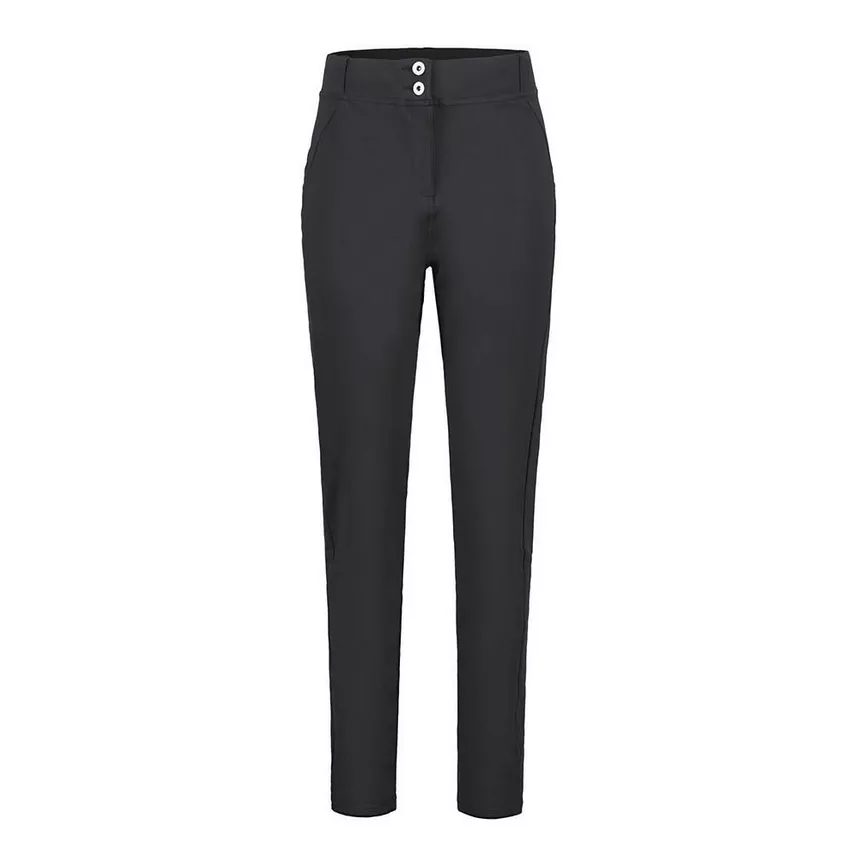 Napakka ja joustava materiaali tukee kehoa ja säilyttää muotonsa käytössä, mikä tekee housuista pitkäikäiset ja luotettavat. Korkea vyötärö antaa miellyttävän tuen keskivartalolle ja varmistaa, että housut pysyvät hyvin paikoillaan liikkeessä. Materiaali tuntuu pehmeältä ihoa vasten ja joustaa luonnollisesti, mutta ei löysty käytössä. Housuissa on napit sekä vetoketju, jotka luovat huolitellun ilmeen.
